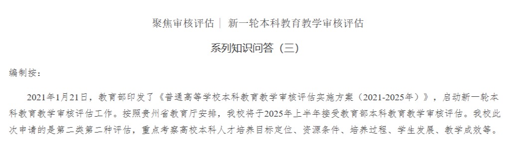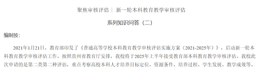 聚焦审核评估 | 新一轮本科教育教学审核评估系列知识问答(三)编制按:2021年1月21日,教育部印发了《普通高等学校本科教育教学审核评估实施方案(2021-2025年)》,启动新一轮本科教育教学审核评估工作。按照贵州省教育厅安排,我校将于2025年上半年接受教育部本科教育教学审核评估。我校此次申请的是第二类第二种评估…