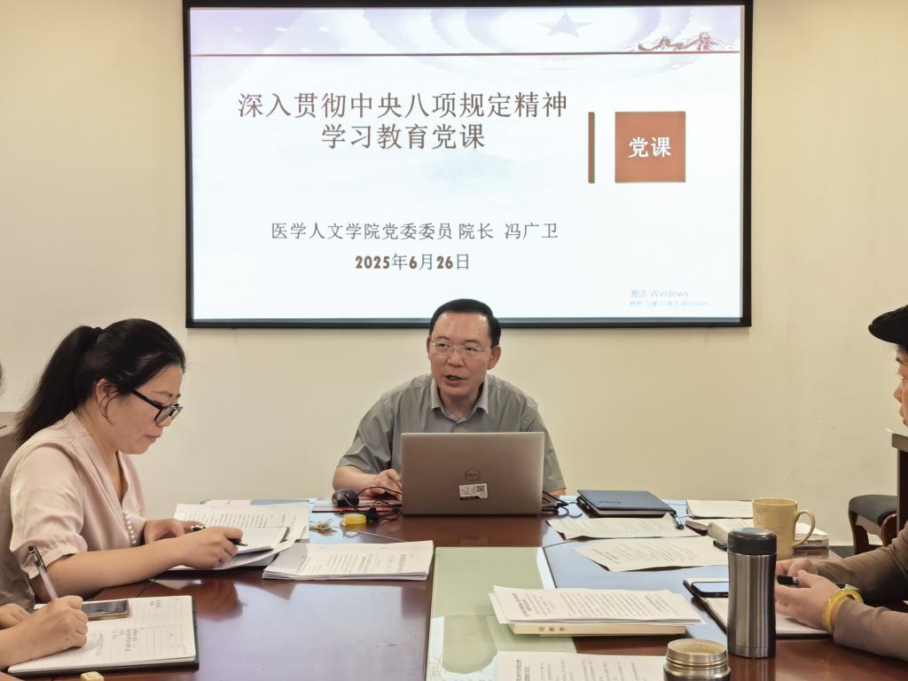 6月26日,学院党委委员、院长冯广卫在善思楼2-40会议室讲授了深入贯彻中央八项规定精神学习教育党课。学院副科级以上干部、各党支部书记及支委成员、科室、教研室(中心)负责人参加党课学习。党课由学院党委委员、正处级组织员刘雪梅主持。冯广卫围绕“深入学习领会习近平总书记关于加强党的作风建设的重要论述”“准确…