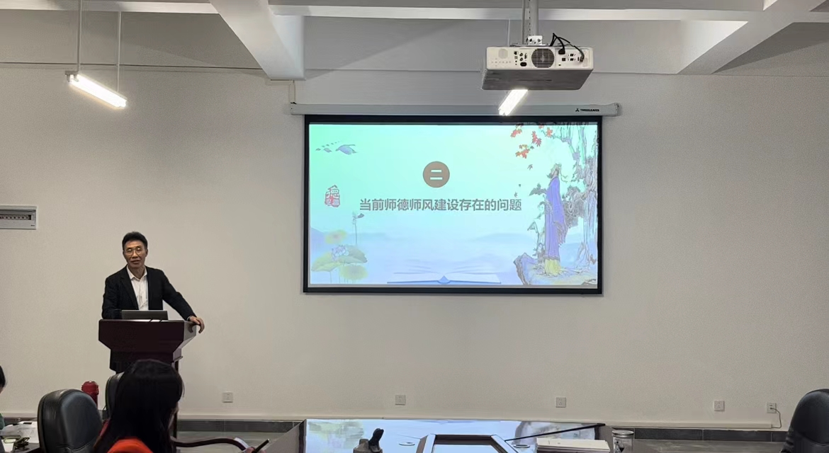 韩贞习以“加强师德师风建设,做新时代‘四有’ 好老师”为主题,从为什么要加强师德师风建设、当前师德师风建设存在的问题和如何加强师德师风建设三个方面进行讲授。他指出,加强师德师风建设是办好新时代人民满意教育、教师自身发展和学校事业发展的需要。他通报了教育部公开曝光违反教师职业行为十项准则典型案例,指出我院师德师风建设存在的问题。他强调要深入学习领会习近平总书记关于师德师风的重要指示批示精神、严格贯彻落实师德师风政策法规,并将师德师风建设贯穿学院工作全过程。