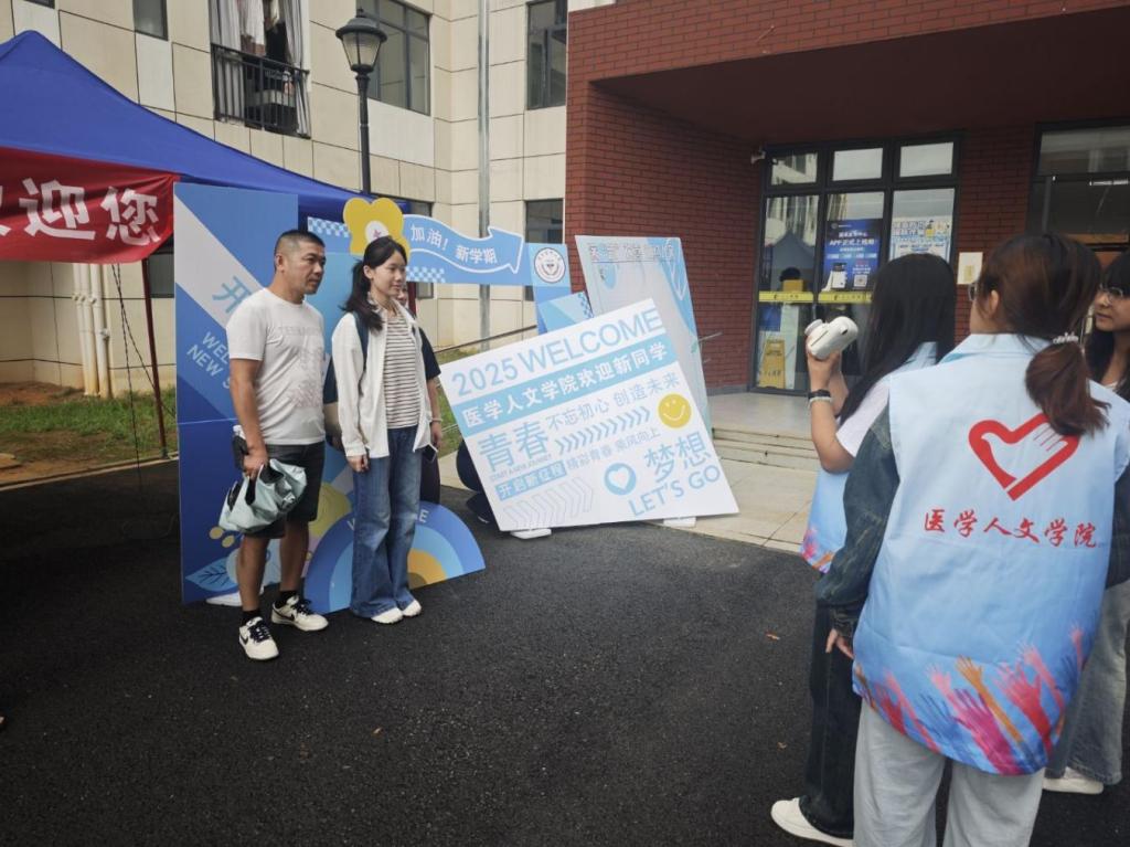 迎新期间,学院组建的40余名“人文迎新志愿者”团队成为校园里一道亮眼的风景线。志愿者们身着统一服装,分设“入校引导岗”“流程咨询岗”“行李搬运岗”,从校门口到迎新点,从报到登记到宿舍楼下,全程护送新生抵达寝室,用热情与汗水传递“学长学姐的关怀”。