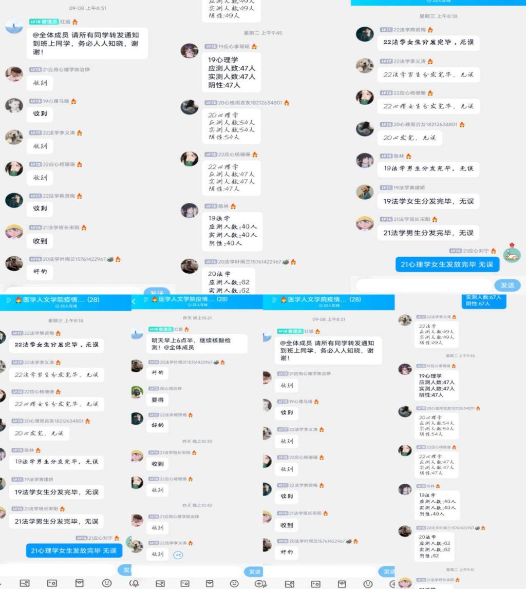 接到疫情防控通知后,学生干部及时下达消息,确保每一位同学都知悉学院通知。防控期间,学生干部严格执行相关规定,每天督促同学们完成今日校园的日常健康监测填报,一丝不苟,不落一人。做新冠抗原检测时,他们会提前一个半小时领取抗原检测物品,在确认数量无误、包装完好后登记领取人信息。随后,亲自发放抗原检测物品至每一位同学手中,督促同学们及时完成检测并填报表格。接收到当天需要做核酸检测的通知时,及时下达消息,收集上报检测结果等工作。