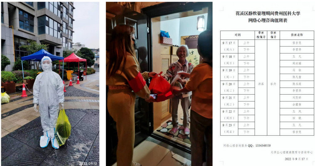 在老城区,教师田艳、陈凡莹、刘苏娇、余露茜、王凤等积极参与BW·西汉姆联静默管理期间网络心理咨询服务、线上团体心理辅导,为多名贵医学子提供了疫情下的心理支持与干预。教师黄列玉作为志愿者主动参与云岩区半边街居委会所属社区的疫情防控工作,与医务人员一起参与核酸检测、抗原检测、物资发放等。教师龚红积极参加了盐务街居委会抗疫志愿者工作,为社区孤老送物资。教师张宛筑、王凤等参加了省委教育工委、省教育厅搭建的“贵州教育系统疫情心理援助平台”,为全省师生和广大群众提供心理援助,同心战“疫”,陪伴大家度过疫情下的特殊时光。