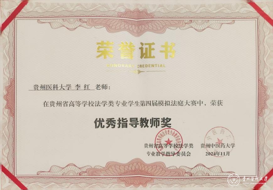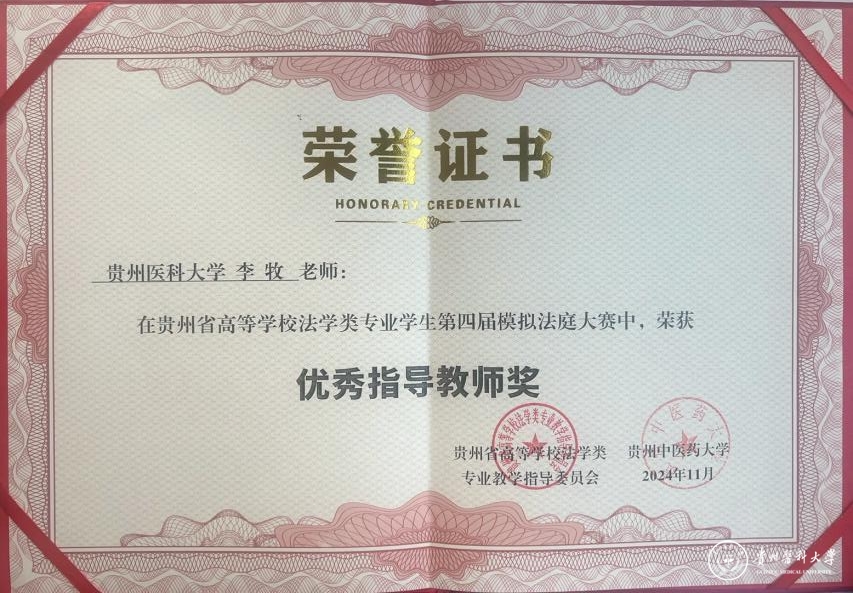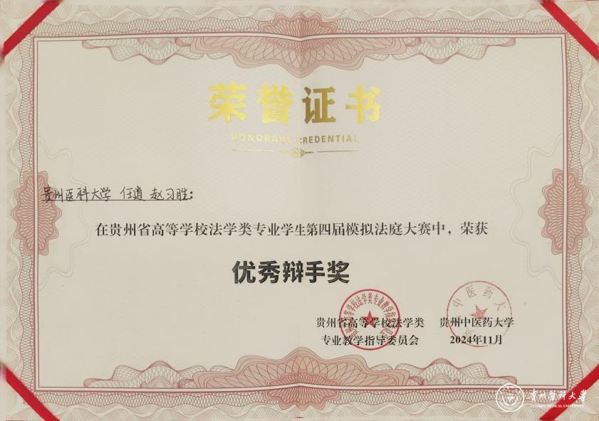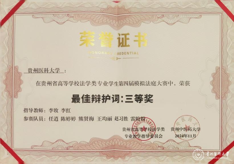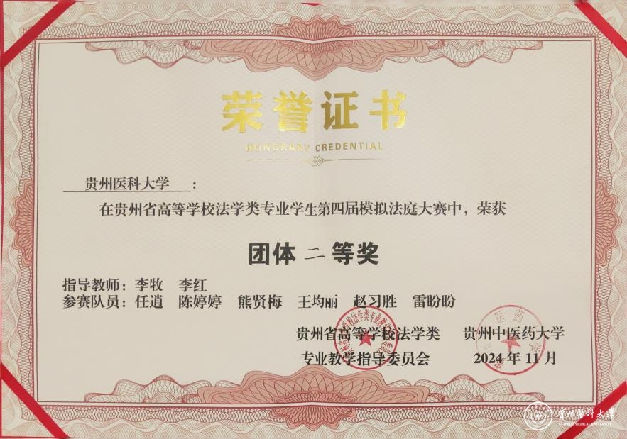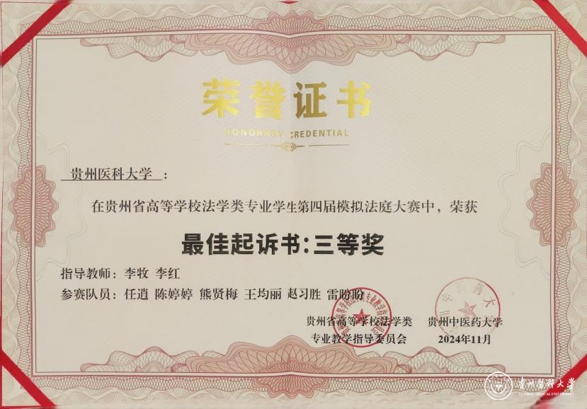 本次参赛队由李牧、李红老师指导,我院2022级法学专业任逍、赵习胜、王均丽、陈婷婷、熊贤梅、雷盼盼六名同学参赛。经过初赛评比,包括我校在内的共八支贵州省法学专业院校队伍进入复赛,在复赛中,我院同学展现了深厚的法律功底和严谨的逻辑思维能力,以最高分进入总决赛,并最终获得了团体第二名的好成绩。任逍、赵习胜同学获得优秀辩手奖,法律文书获最佳起诉书三等奖、最佳辩护词三等奖,李牧、李红老师获得优秀指导教师奖。
