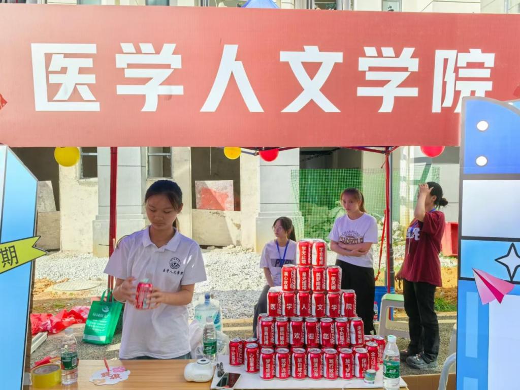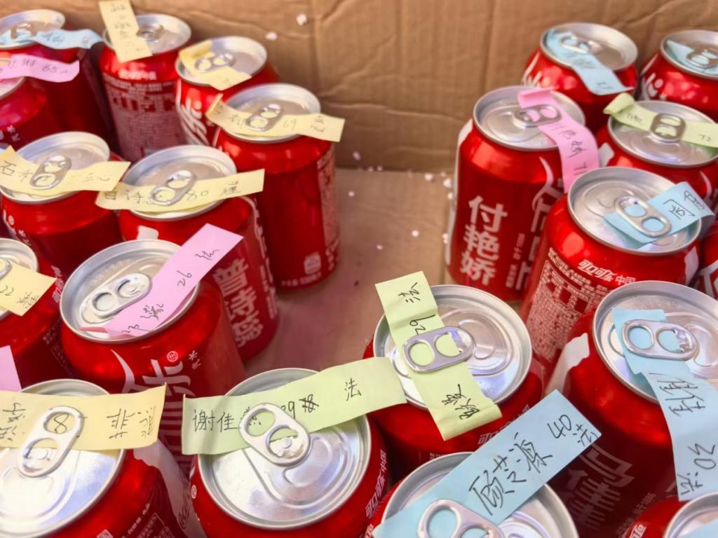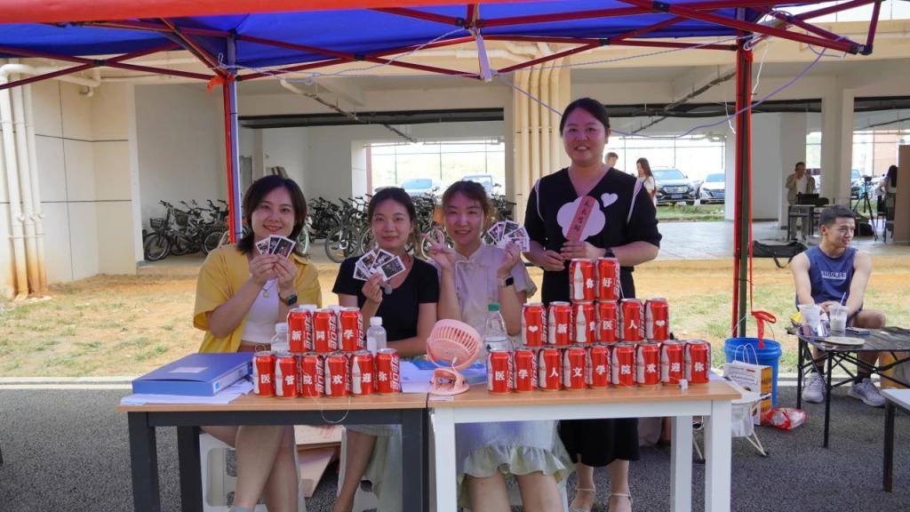 在学院新生报到点,考虑到天气炎热,学院为每一位新同学定制了个人姓名的可乐和带有祝福语的扇子,希望在炎炎烈日中为新生送去一丝凉爽。