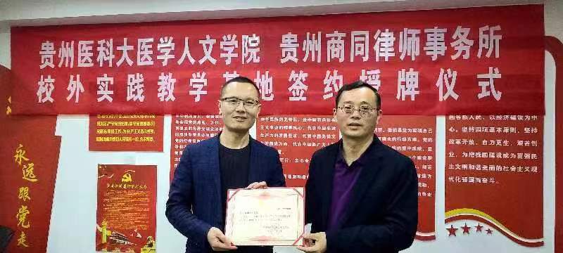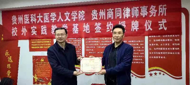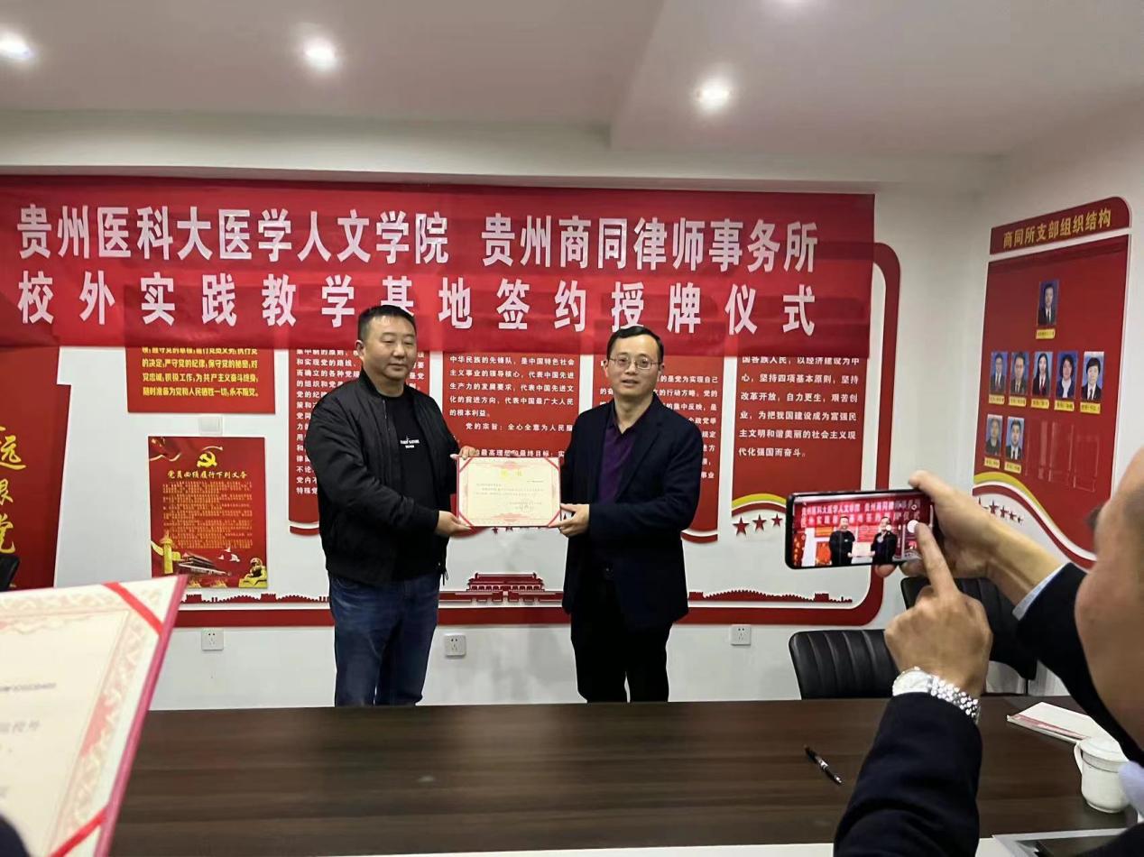 江宣成与冉政林签署了全面合作框架协议、共建实践教学基地协议,并向贵州商同律师事务所授牌BETWA西汉姆联实践教学基地,并向受聘校外实践指导教师颁发证书。