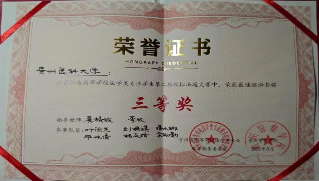 本次大赛由贵州省高等学校法学类专业教学指导委员会主办,贵州警察学院承办。全省高校法学院(系)共12支代表队参加比赛,评由在职法官、检察官、执业律师、法学专家组成,并严格按照人民法院规范的庭审流程进行。经过初赛、决赛的激烈角逐,由龚精诚、李牧指导的我校法学专业代表队荣获团体等奖、最佳起诉书等奖。