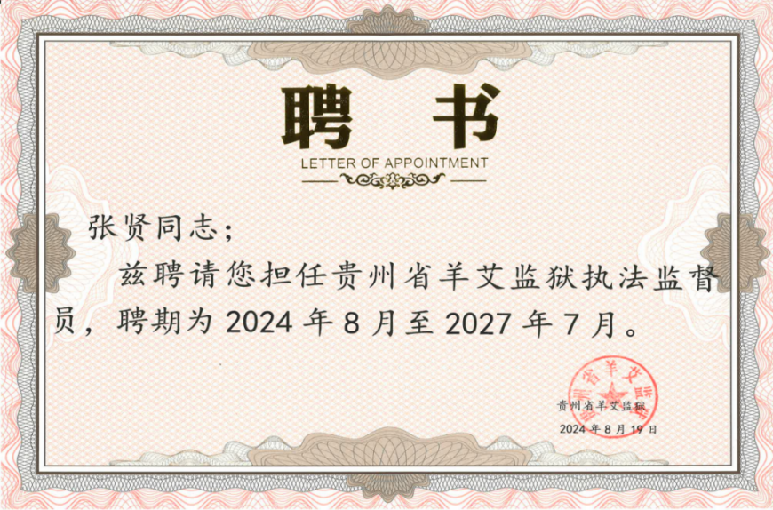 贵州省羊艾监狱作为我院教学实践基地,双方在培养法律人才、深化党建合作、共促社会公益、强化心理援助、推动法学研究与法律援助实践等方面合作共建。为进一步推进合作共建,提升内涵建设,贵州省羊艾监狱聘请我院党委副书记兼纪委书记张贤担任其执法监督员。