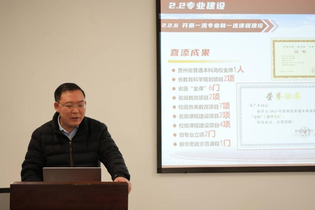 学院院长冯广卫从学院基本情况、本科教育教学审核评估工作开展情况、目前工作完成进度、后期计划和新学期工作部署开展情况做了详细汇报。