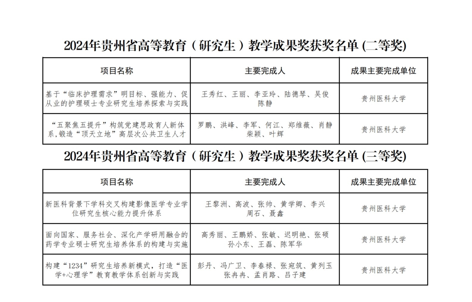 近日,贵州省教育厅下发了《省教育厅关于公布2024年贵州省高等教育省级教学成果奖获奖名单的通知》,我校17项教学成果获奖(本科教育12项、研究生教育5项),其中,特等奖1项,一等奖4项、二等奖5项、三等奖7项。