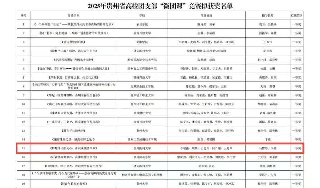 近日,2025年贵州省高校团支部“微团课”竞赛拟获奖名单正式公示。本次赛事历经高校择优推荐、专家网络评审、现场终审决赛等环节评选,全省193个优秀项目脱颖而出,我院选送的微团课作品《黔地烽火照初心,山河新颜谱华章》凭借深刻的思想内涵、新颖的呈现形式与真挚的情感表达,最终斩获省级一等奖。在决赛现场,我院参…